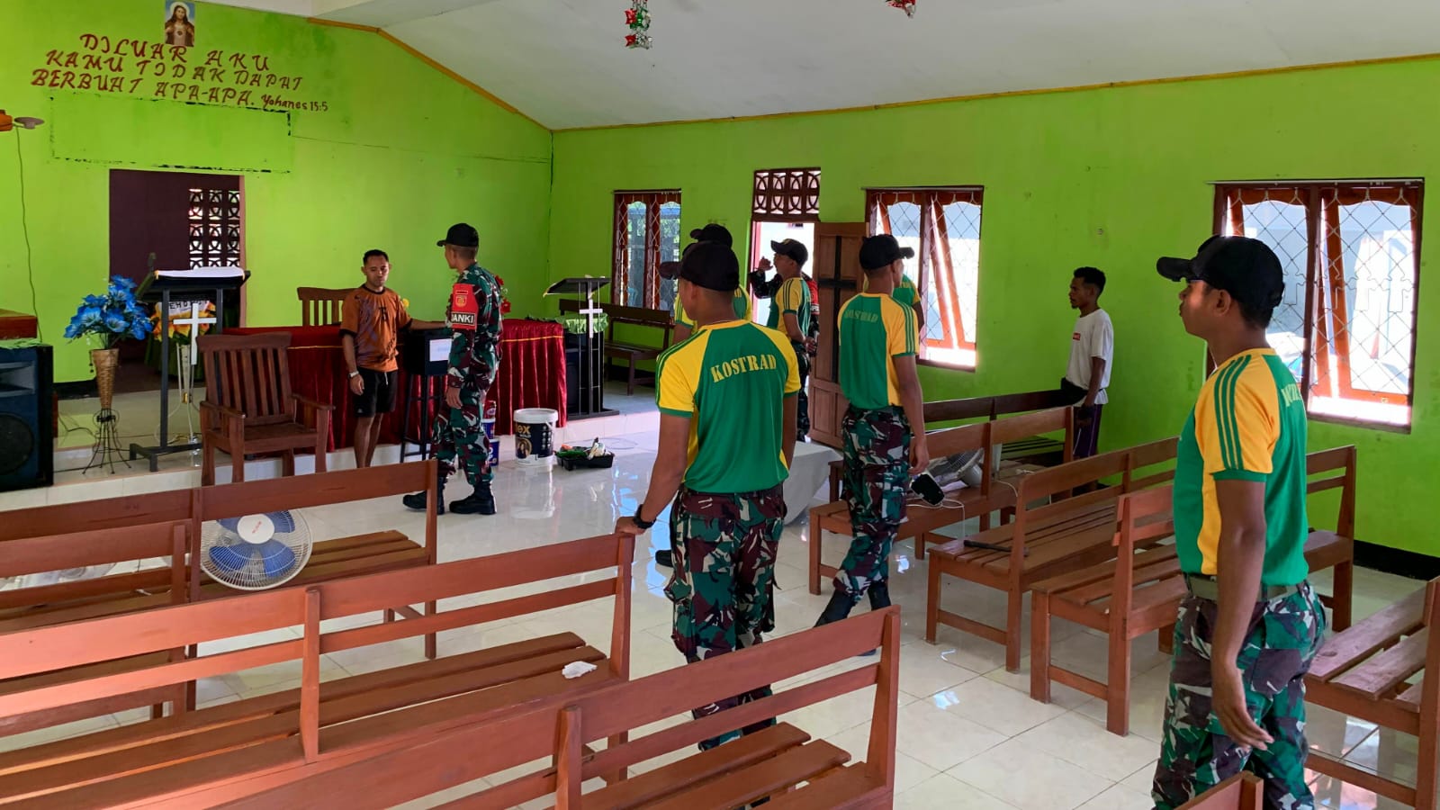 Kegiatan difokuskan pada pembersihan lingkungan dan pengecatan ulang bangunan gereja sebagai bentuk dukungan Satgas terhadap kenyamanan sarana ibadah warga.