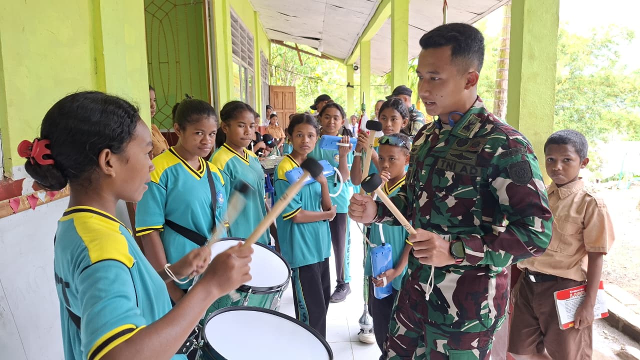 TTS – Satgas Pamtas RI-RDTL Sektor Barat Yonarhanud 2 Kostrad memberikan dukungan tenaga pendidik (Gadik) ajarkan keterampilan bermain Drumband di SMPN Bestaumuti, Kecamatan Tobu, Kabupaten TTS, Rabu (28/01/2026).
