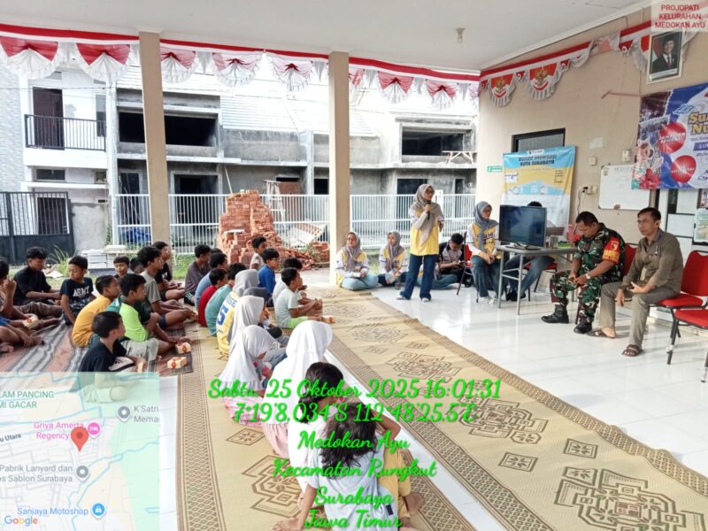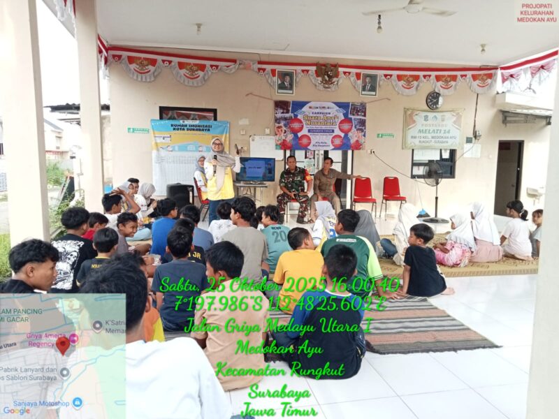 Surabaya – Wepose (We’re Different But One Purpose) “Kita Beda-Kita Kerjasama”. Komunitas Peduli Anak ada di 30 Titik di Surabaya 5 kota di Indonesia. Dihadiri oleh Babinsa Koramil 0830/11 Rungkut, Serka Imam Nasikun, Projopati Kelurahan Medokan Ayu, Uji Siswanto, Ketua RW15 Kelurahan Medokan Ayu, Mikhael Markus beserta Ketua RT02, Hermansyah dan peserta Sosialisasi Wepose anak tingkat SMP (Sekolah Menengah Pertama) yang bertempat di Balai RW15 Jl. Griya Medayu Utara I Kelurahan Medokan Ayu Kecamatan Rungkut Kota Surabaya pada Sabtu, 25-10-2025.