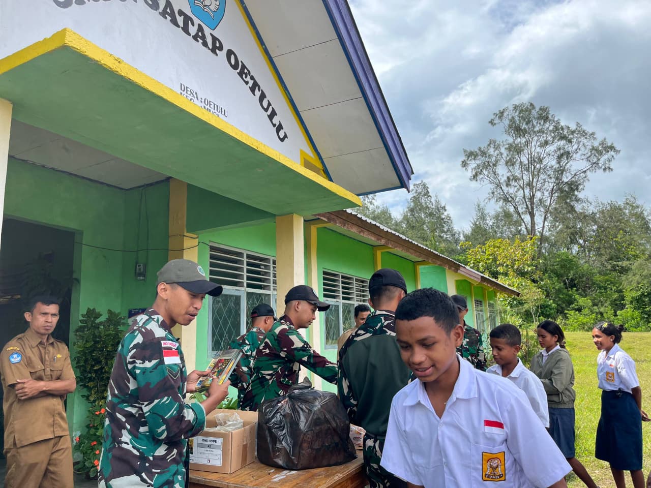 TTU – Satgas Pamtas RI–RDTL Sektor Barat Yonarhanud 2 Kostrad Pos Haumeniana melaksanakan kegiatan berbagi bubur kacang hijau di SMPN Satap Oetulu, Desa Oetulu, Kecamatan Musi, Kabupaten TTU, Selasa (03/02/2026).