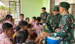 Belu – Dalam upaya menumbuhkan semangat kebersamaan dan kepedulian terhadap generasi muda di wilayah perbatasan, Pos Salore Satgas Pamtas RI–RDTL Sektor Timur Yonarmed 12 Kostrad melaksanakan kegiatan pemberian bubur kacang ijo gratis kepada para pelajar SDN 1 Salore, Kecamatan Tasifeto Timur, Kabupaten Belu, Nusa Tenggara Timur. Kegiatan ini dipimpin langsung oleh Danpos Salore, Lettu Arm Arif Adiyanto.
