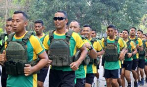 Atambua — Prajurit Satgas Pengamanan Perbatasan RI–RDTL Yonarmed 12 Kostrad melaksanakan kegiatan lari pagi di Alun-alun Kota Atambua. Kegiatan tersebut dilakukan menggunakan body vest yang diisi dengan plat baja sebagai bentuk latihan fisik intensif untuk meningkatkan daya tahan dan kekuatan tubuh prajurit. Sabtu (08/11/2025).