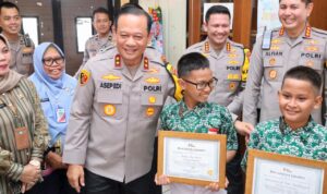 Jakarta – Kapolda Metro Jaya Irjen Pol Asep Edi Suheri memberikan apresiasi langsung kepada enam siswa SDN Setu 02 Cipayung, Jakarta Timur, atas sikap jujur dan tanggung jawab mereka setelah menemukan telepon genggam dan surat izin mengemudi (SIM), lalu mengembalikannya ke Polsek Cipayung.