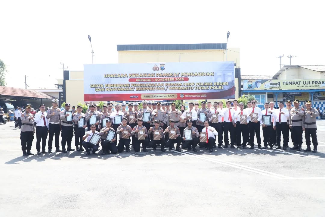 Kediri – Polres Kediri Polda Jawa Timur menggelar upacara pemberian penghargaan kepada personel berprestasi dan masyarakat yang mendukung tugas Polri, serta korps rapor kenaikan pangkat pengabdian.