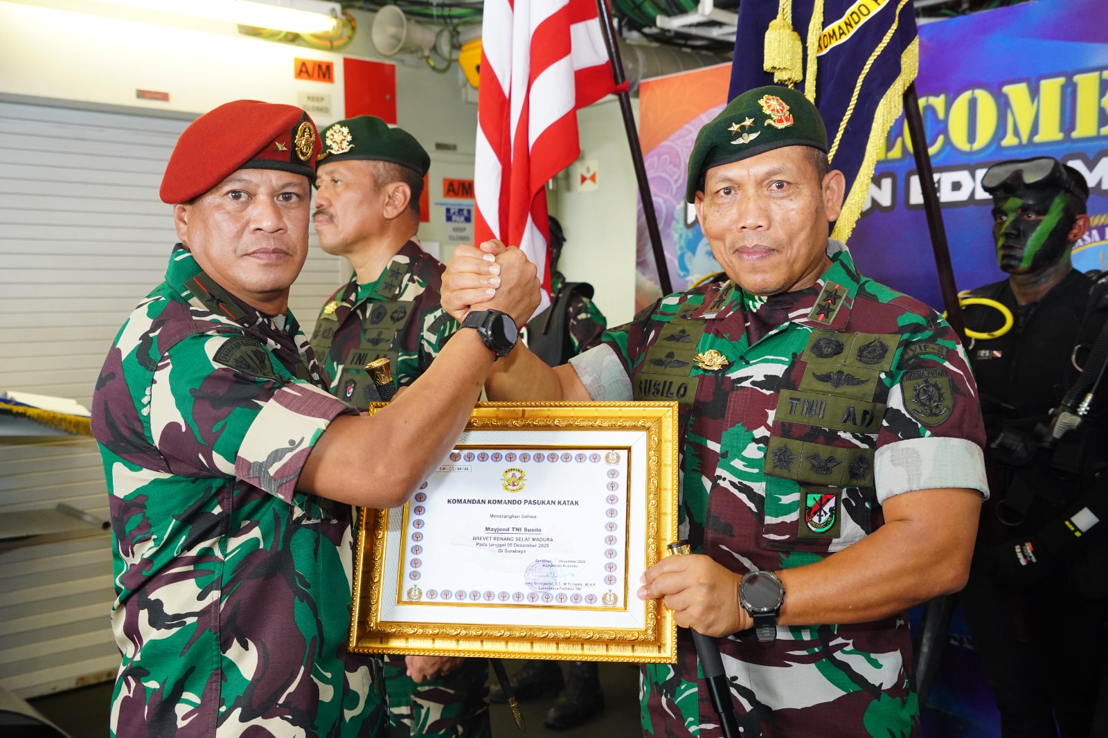 Dalam kesempatan tersebut, Kaskostrad dan Pangdivif 2 Kostrad juga menerima penyematan Brevet Kehormatan Hiu Kencana yang disematkan langsung oleh Dankopaska Koarmada RI Laksma TNI Joko Andriyanto, sebuah simbol kebanggaan prajurit TNI AL.