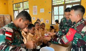 Belu – Prajurit Satgas Pamtas RI–RDTL Sektor Timur Yonarmed 12 Kostrad yang bertugas di Pos Nunura kembali menunjukkan kepeduliannya terhadap dunia pendidikan dan kesejahteraan anak-anak di wilayah perbatasan. Kali ini, para prajurit melaksanakan kegiatan sebagai tenaga pendidik sekaligus membagikan kolak gratis kepada siswa-siswi SDN Sekutren, Kecamatan Raihat, Kabupaten Belu, Nusa Tenggara Timur.