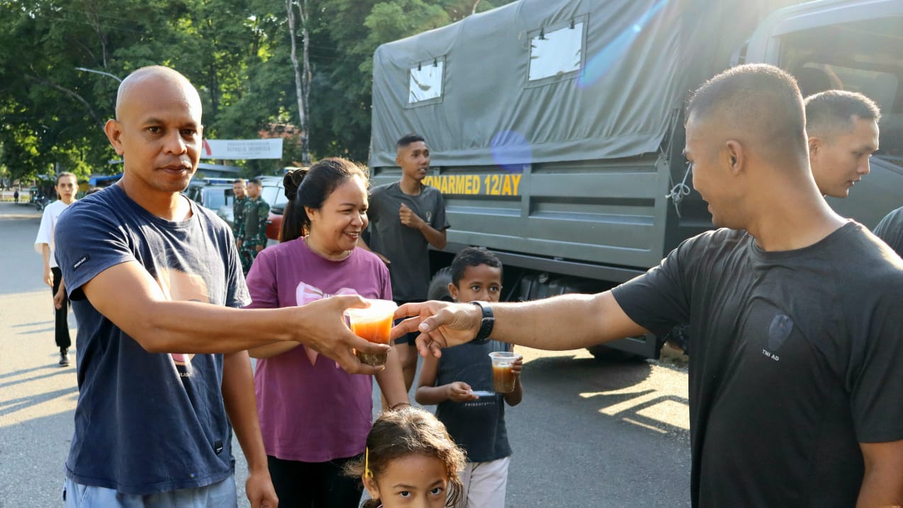 Setibanya di Alun-Alun Atambua, kegiatan dilanjutkan dengan pendinginan dan pembagian bubur kacang ijo kepada para prajurit serta warga yang hadir. Momen sederhana ini menjadi bentuk perhatian Satgas terhadap pentingnya menjaga stamina dan silaturahmi di wilayah penugasan.