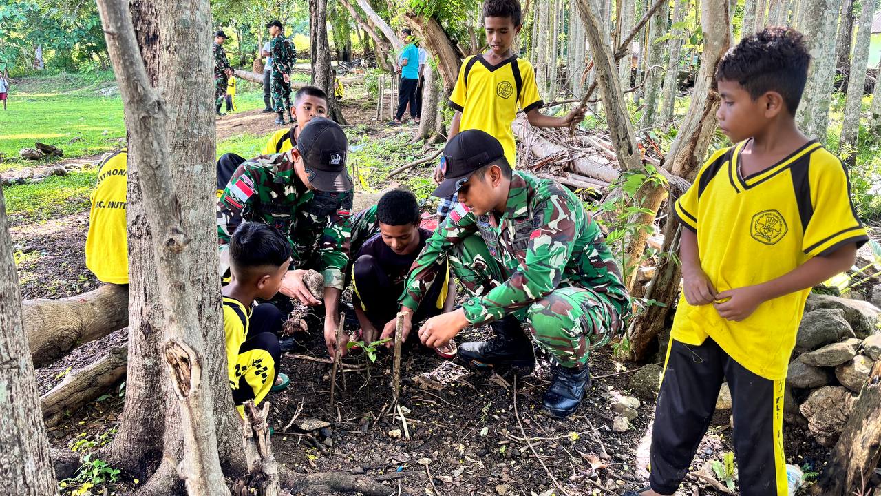 ‎Danpos Aplal, Letda Arh Arya menyampaikan “Kami ingin menanamkan rasa cinta alam kepada generasi muda di perbatasan sejak dini. Setiap bibit yang kita tanam hari ini adalah investasi oksigen dan masa depan bagi anak-anak di Tasinifu.”