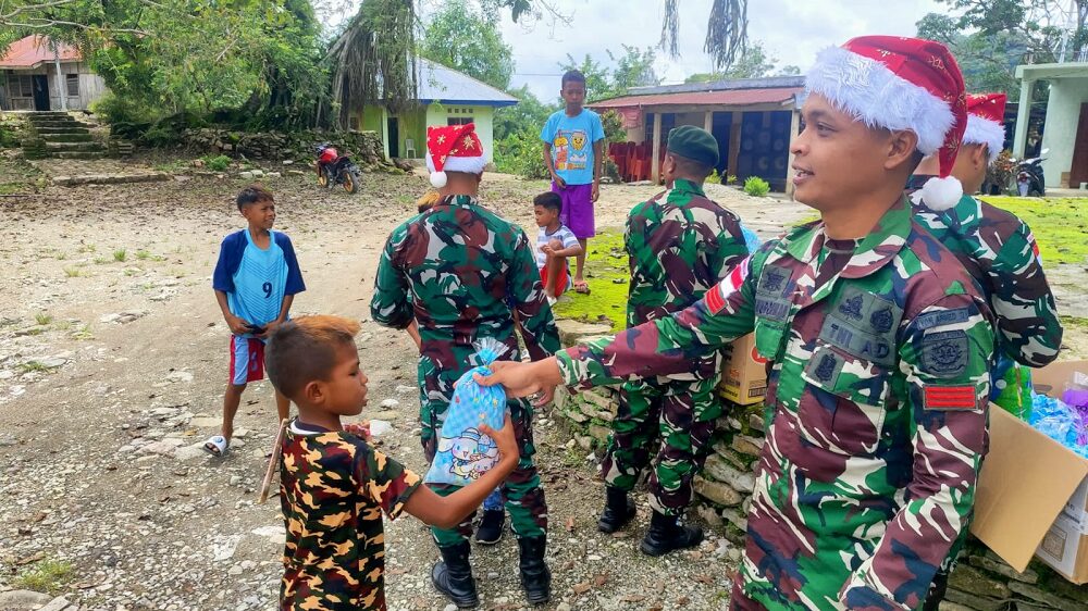 Belu – Satgas Pamtas RI–RDTL Sektor Timur Yonarmed 12 Kostrad Pos Kewar melaksanakan kegiatan pembagian bingkisan dalam rangka perayaan Natal kepada masyarakat Desa Kewar, Kecamatan Lamaknen, Kabupaten Belu, Sabtu (27/12/2025). Kegiatan ini merupakan bentuk kepedulian dan kebersamaan Satgas Pamtas dengan masyarakat di wilayah perbatasan.