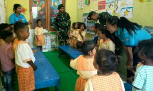 Malaka — Prajurit Pos Motamasin Satgas Pamtas RI-RDTL Yonarmed 12 Kostrad melaksanakan kegiatan bakti sosial di PAUD Sely yang terletak di Desa Rainawe, Kecamatan Kobalima Timur, Kabupaten Malaka. Kegiatan ini dilakukan sebagai bentuk kepedulian terhadap pendidikan anak-anak di wilayah perbatasan. Senin (10/11/2025).