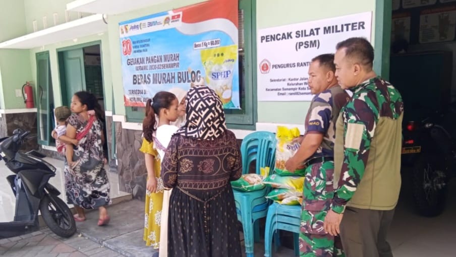 Surabaya — Upaya membantu masyarakat mendapatkan kebutuhan pokok dengan harga terjangkau terus dilakukan jajaran Kodim 0830/Surabaya. Salahnya Anggota Koramil 0830/02 Semampir yang menggelar penyaluran beras murah kepada warga di sekitar Makoramil, Senin (18/8).