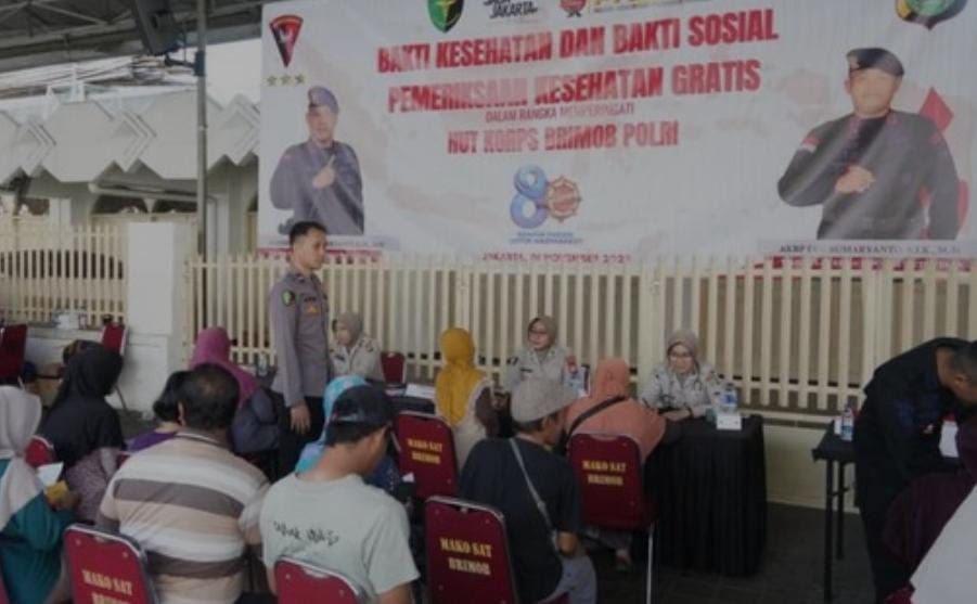 Brimob Polda Metro memberikan pelayanan kesehatan gratis sebagai wujud kepedulian sekaligus mempererat silaturahmi dengan masyarakat.