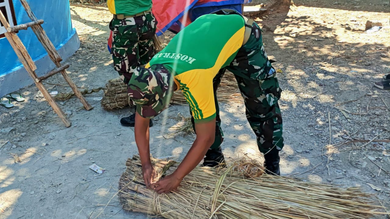 Belu – Wujud nyata kepedulian terhadap pelestarian budaya lokal kembali ditunjukkan oleh Satgas Pamtas RI–RDTL Sektor Timur Yonarmed 12 Kostrad melalui kegiatan karya bakti di Desa Laktutus, Kecamatan Nanaet Dubesi, Kabupaten Belu, Nusa Tenggara Timur. Personel Pos Laktutus bersama masyarakat setempat bergotong royong melaksanakan pemasangan atap jerami pada Rumah Adat milik Suku Tala, yang menjadi simbol kebersamaan dan warisan leluhur masyarakat perbatasan.