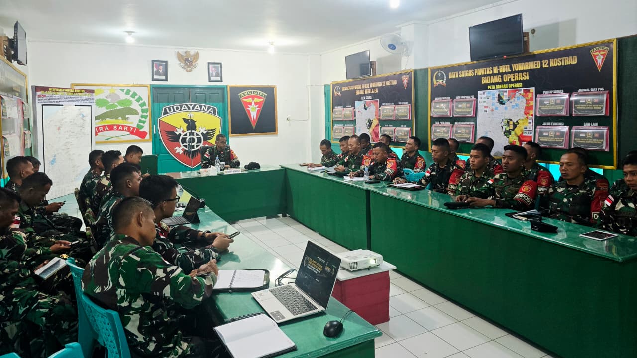 Dansatgas Pamtas RI–RDTL Sektor Timur Yonarmed 12 Kostrad, Letkol Arm Dr. Erlan Wijatmoko S.H., M.Han., dalam sambutannya menyampaikan bahwa evaluasi bulanan sangat penting untuk menjaga kualitas kinerja satuan.