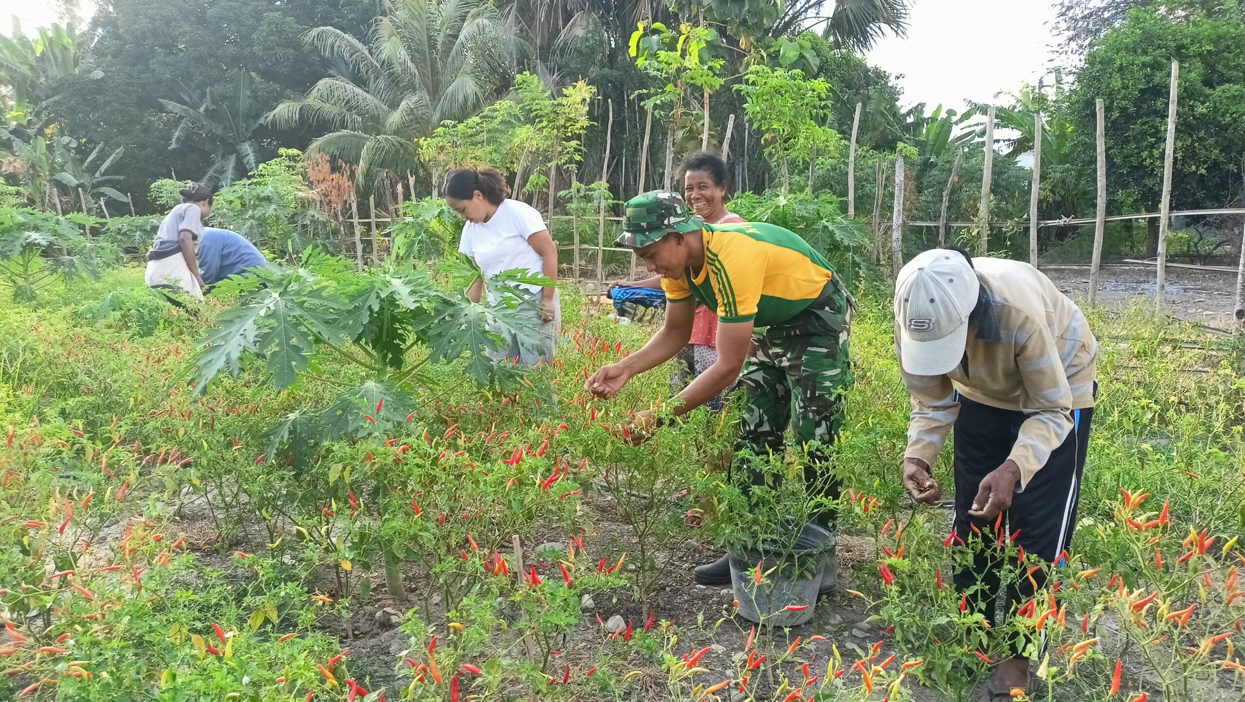 Malaka — Prajurit Satgas Pengamanan Perbatasan (Pamtas) RI-RDTL dari Yonarmed 12 Kostrad yang bertugas di Pos Motamasin melaksanakan kegiatan panen cabai bersama warga perbatasan di Desa Motamasin Kecamatan Kobalima Timur, Kabupaten Malaka, Kamis (06/11/2025).