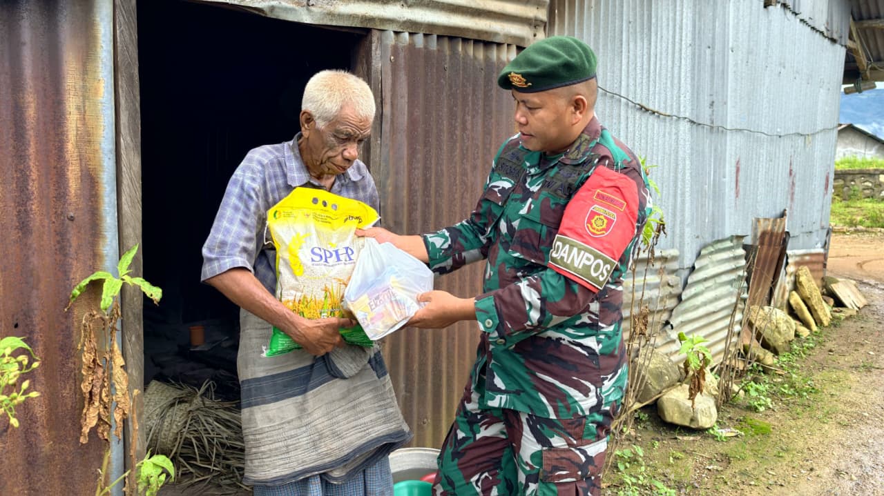 Belu – Satgas Pamtas RI–RDTL Sektor Timur Yonarmed 12 Kostrad melalui Pos Fohuk melaksanakan kegiatan sosial berupa pembagian sembako kepada para lanjut usia (lansia) di sekitar wilayah pos. Kegiatan ini dilaksanakan di Desa Loonuna, Kecamatan Lamaknen Selatan, Kabupaten Belu, Provinsi Nusa Tenggara Timur, sebagai bentuk kepedulian terhadap masyarakat perbatasan yang membutuhkan perhatian lebih.