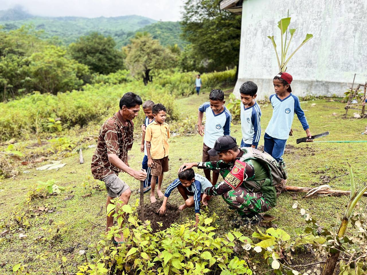 TTU – Satgas Pamtas RI–RDTL Sektor Barat Yonarhanud 2 Kostrad Pos Nino melaksanakan pendampingan dan bimbingan kepada siswa dalam kegiatan penanaman pohon pisang sebagai sarana pembelajaran dan pembinaan karakter di SDN 1 Sono, Desa Sono, Kecamatan Bikomi Nilulat, Kabupaten TTU, Selasa (24/02/2026).