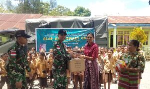 Sebagai bentuk kepedulian dan dukungan terhadap sarana pendidikan di perbatasan, Dansatgas Letkol Arh Endis Fahrul Rizal juga menyerahkan sejumlah bantuan berupa bola voli beserta net, bola kaki, dan snack TNI yang dibagikan untuk para guru dan murid SDK 2 Soeam. (yonarhanud2)