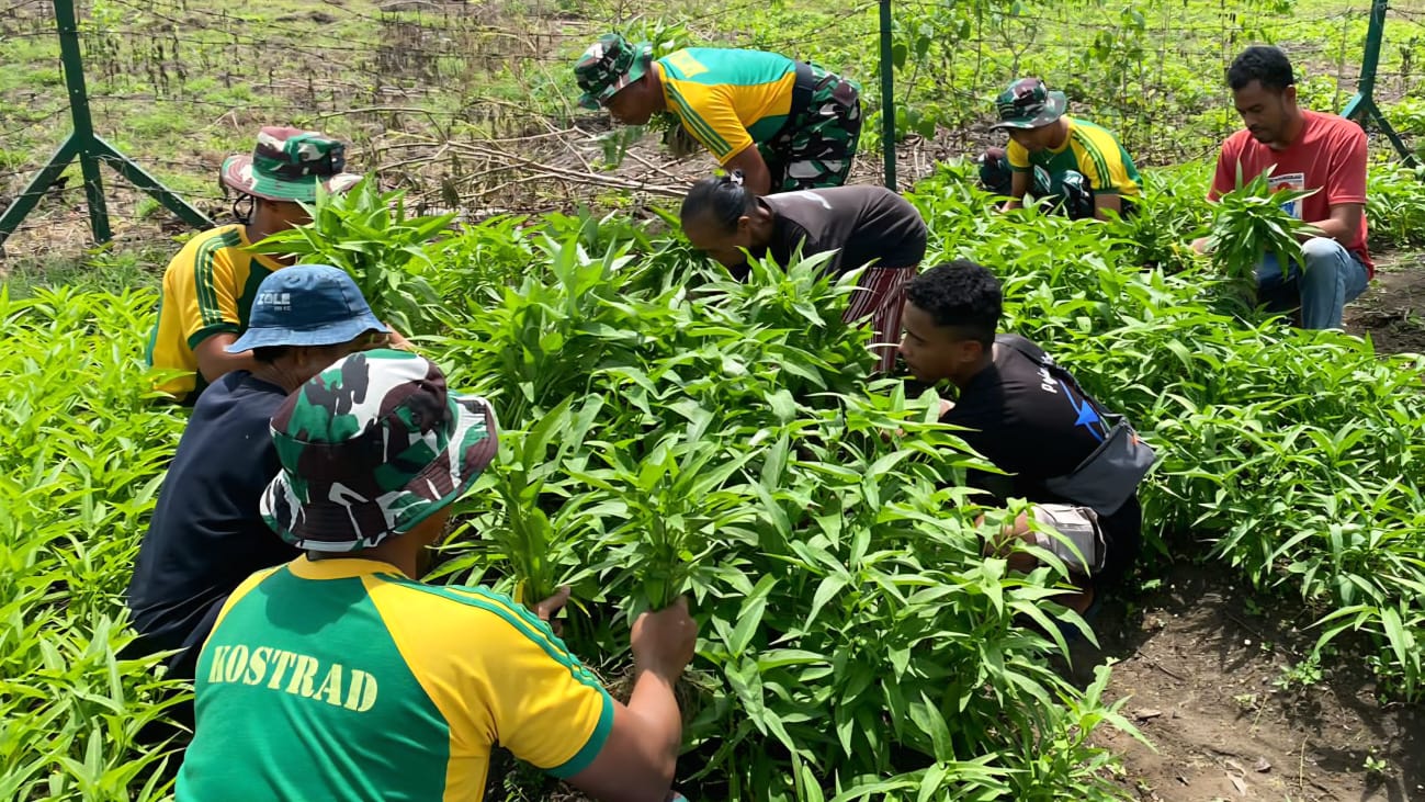 Belu — Prajurit Pos Dafala Satgas Pamtas RI-RDTL Yonarmed 12 Kostrad melaksanakan kegiatan pembinaan teritorial (Binter) berupa panen bersama masyarakat di lahan sayur milik Pos Dafala yang berlokasi di Desa Dafala, Kecamatan Tasifeto Timur, Kabupaten Belu, NTT. Kegiatan ini menjadi wujud nyata kepedulian TNI terhadap upaya peningkatan ketahanan pangan di wilayah perbatasan.