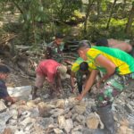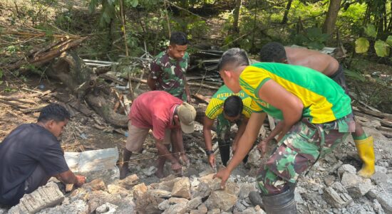 TTU – Satgas Pamtas RI–RDTL Sektor Barat Yonarhanud 2 Kostrad Pos Napan Bawah melaksanakan kegiatan karya bakti membantu pembangunan rumah salah satu