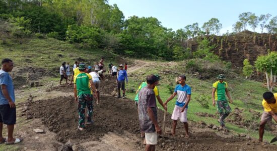 TTU – Satgas Pamtas RI–RDTL Sektor Barat Yonarhanud 2 Kostrad Pos Naekake bersama masyarakat turun langsung ke jalan untuk melakukan perbaikan akses