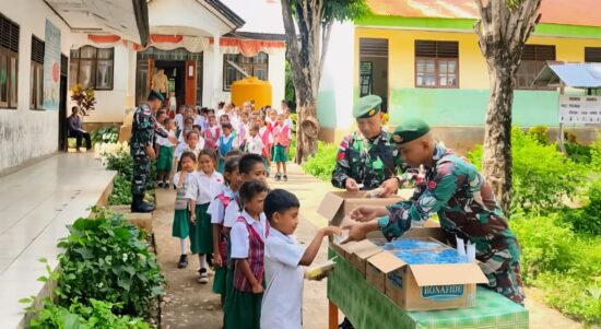 Satgas Pamtas Pos Maubusa Bagikan Bekal Makan Gratis di SD Inpres Beitaus, Desa Asumanu