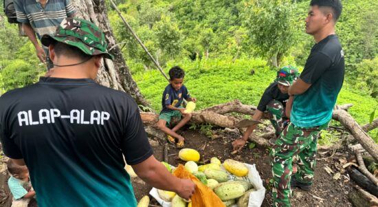 TTU – Satgas Pamtas RI-RDTL Sektor Barat Yonarhanud 2 Kostrad Pos Nelu membantu masyarakat untuk memanen timun di kebun warga di Desa Sunsea,