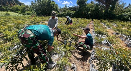 Malaka – Satgas Pamtas RI–RDTL Sektor Timur Yonarmed 12 Kostrad melalui Pos Haslot melaksanakan kegiatan panen cabai bersama masyarakat di Dusun Metamauk,