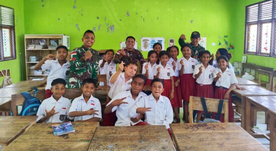 Belu – Personel Pos Kewar Satgas Pamtas RI–RDTL Sektor Timur melaksanakan kegiatan pengajaran materi berhitung kepada siswa SDK 1 Fulur, Desa Fulur,