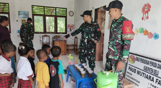 Belu – Satgas Pamtas RI–RDTL Sektor Timur Yonarmed 12 Kostrad melalui Pos Fatubesi Atas melaksanakan kegiatan pembagian bubur kacang hijau kepada anak-anak