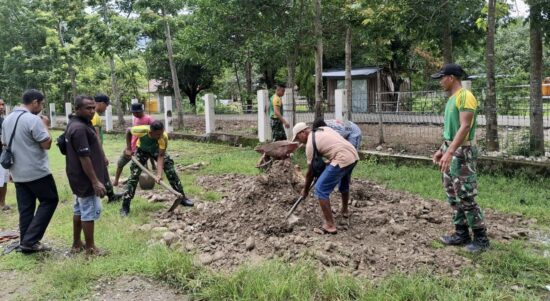 Belu – Satgas Pamtas RI–RDTL Sektor Timur Yonarmed 12 Kostrad melaksanakan kegiatan pemerataan tanah di jalan sekitar Gereja Katolik St. Maria Bunda