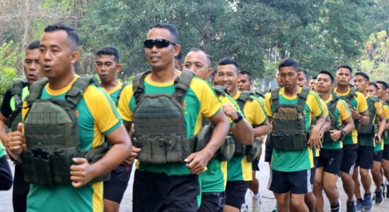 Atambua — Prajurit Satgas Pengamanan Perbatasan RI–RDTL Yonarmed 12 Kostrad melaksanakan kegiatan lari pagi di Alun-alun Kota Atambua. Kegiatan tersebut dilakukan menggunakan body