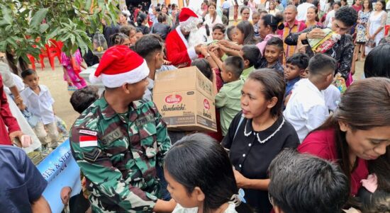 Belu – Dalam rangka perayaan Natal, makosatgas Satgas Pamtas RI–RDTL Sektor Timur Yonarmed 12 Kostrad melaksanakan kegiatan pembagian bingkisan sebagai wujud kepedulian