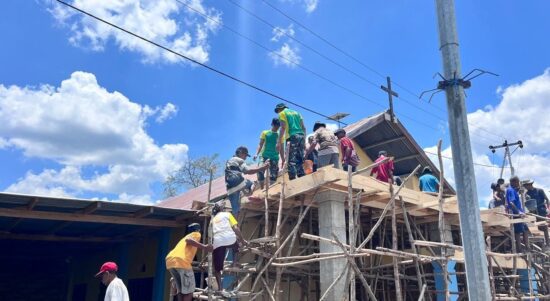TTU – Prajurit Satgas Pamtas RI-RDTL Sektor Barat Yonarhanud 2 Kostrad Pos Haumeniana mengadakan gotong royong pengecoran atap Gereja Kapela Haumeniana bersama