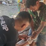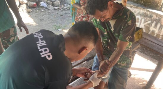 TTU – Satgas Pamtas RI-RDTL Sektor Barat Yonarhanud 2 Kostrad Pos Oepoli Sungai dengan sigap memberikan penanganan kesehatan kepada warga yang terluka