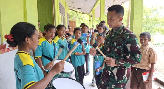 TTS – Satgas Pamtas RI-RDTL Sektor Barat Yonarhanud 2 Kostrad memberikan dukungan tenaga pendidik (Gadik) ajarkan keterampilan bermain Drumband di SMPN Bestaumuti,