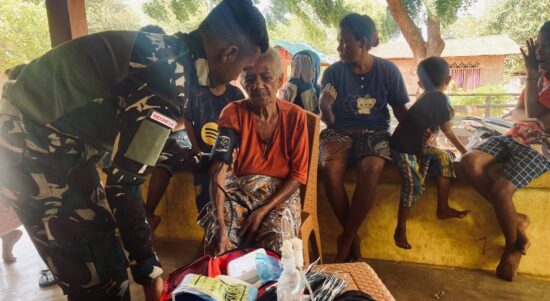 Kupang – Satgas Pamtas RI-RDTL Sektor Barat Yonarhanud 2 Kostrad Pos Oepoli Sungai melaksanakan bakti sosial berupa pelayanan kesehatan gratis yang disambut
