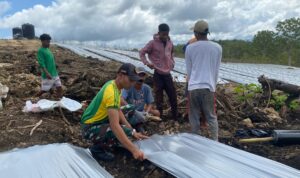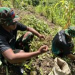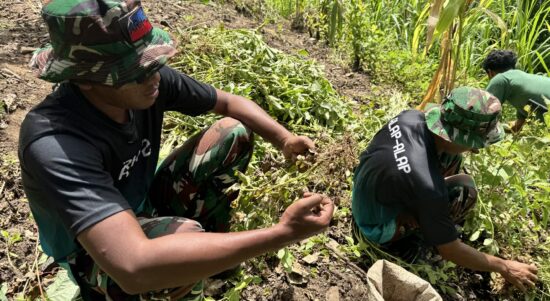 TTU – Satgas Pamtas RI-RDTL Sektor Barat Yonarhanud 2 Kostrad Pos Nelu membantu warga perbatasan memanen kacang tanah di Desa Sunsea, Kecamatan