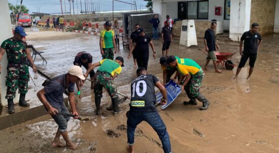 Yonarmed 12 Kostrad dan Petugas PLBN Motaain Gotong Royong Bersihkan Lumpur Dampak Hujan Deras