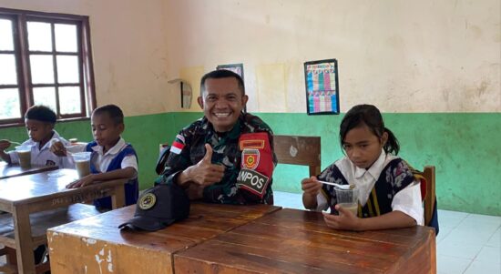 Belu – Satgas Pamtas RI–RDTL Sektor Timur Yonarmed 12 Kostrad melalui Pos Maubusa melaksanakan kegiatan pembagian bubur kacang hijau kepada siswa-siswi SD