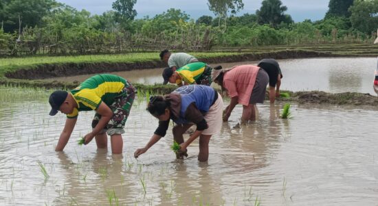 Belu — Satgas Pamtas RI–RDTL Sektor Timur Yonarmed 12 Kostrad melalui Pos Salore melaksanakan kegiatan penanaman bibit padi bersama warga Desa Tulakadi,