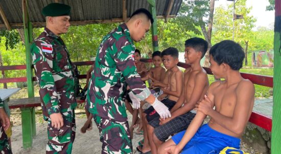 Belu – Personel Pos Salore Satgas Pamtas RI–RDTL Sektor Timur dari Yonarmed 12 Kostrad melaksanakan kegiatan pelayanan kesehatan bagi anak-anak di wilayah