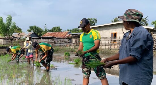 Belu — Satgas Pamtas RI–RDTL Sektor Timur Yonarmed 12 Kostrad melalui Pos Motaain melaksanakan kegiatan penanaman bibit padi bersama masyarakat di Desa