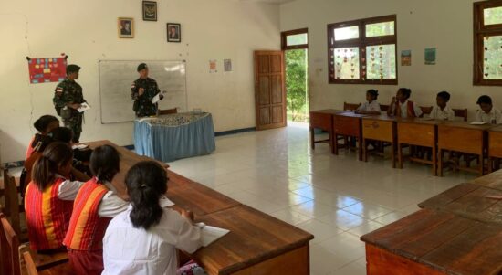 Belu — Satgas Pamtas RI–RDTL Sektor Timur Yonarmed 12 Kostrad melalui Pos Lakmars melaksanakan kegiatan pengajaran dan pendidikan kepada siswa Sekolah Dasar