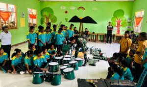 Tobu – Dalam rangka mendukung kemajuan pendidikan dan membina karakter generasi muda di wilayah perbatasan, personel Makosatgas Pamtas RI-RDTL Sektor Barat Yonarhanud 2 Kostrad memberikan pengajaran bermain Drumband kepada siswa-siswi SMPN Bestaumuti, Kecamatan Tobu, Kabupaten TTU, Rabu (29/10/2025).
