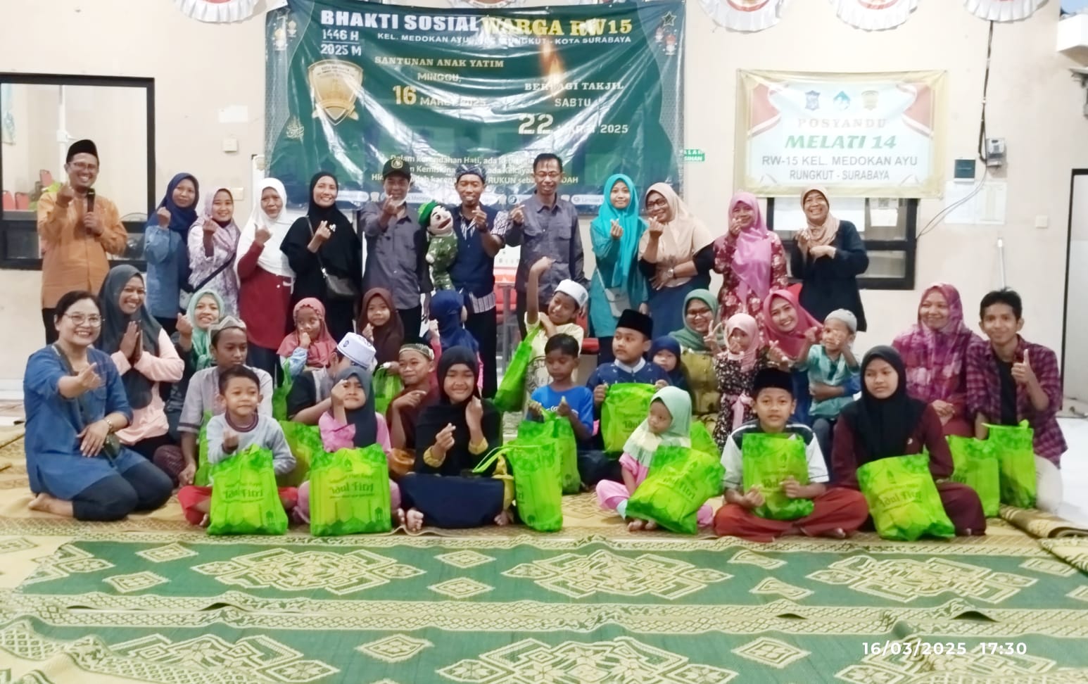 Beberapa hal tersebut, Warga RW15 Kelurahan Medokan Ayu Kecamatan Rungkut Kota Surabaya dengan swadaya gotong royong berupaya mengamalkan kebahagiaan terhadap sesama dengan di koordinir oleh pengurus RW15 dan para Ketua RT serta kSH (Kader Surabaya Hebat) RW15 membuka donasi sukarela dari warga untuk sesama. Beberapa kegiatan yang dilaksanakan di bulan Suci Ranadhan 1446 Hijriyah adalah Santunan Anak Yatim yang ditempatkan di Pendopo Balai RW15 Jl. Griya Medayu Utara I Surabaya pada Minggu, 16 Maret 2025 pukul 16:00 hingga Buka Bersama.