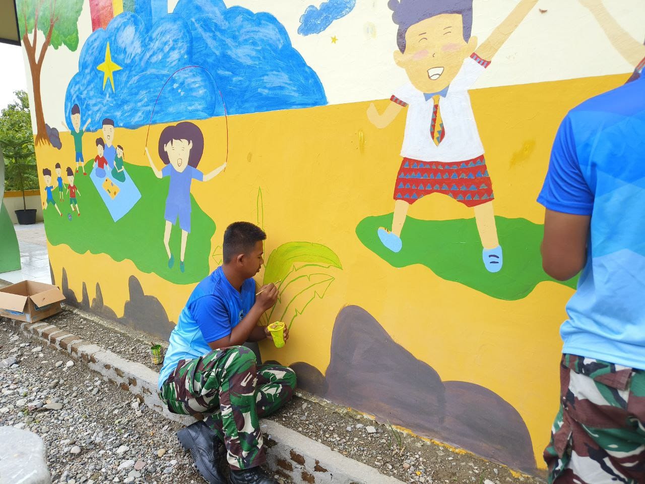 Sambil memegang kuas dan alat cat, para prajurit melukiskan tembok dengan penuh semangat, menciptakan lingkungan yang indah dan tentunya hal positif ini akan meningkatkan semangat belajar anak-anak di wilayah perbatasan. (yonarhanud2)