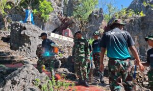 Dalam kesempatan ini, TNI dan masyarakat membersihkan lingkungan Goa Maria Eban yang merupakan salah satu tempat yang digunakan Umat Katholik beribadah.