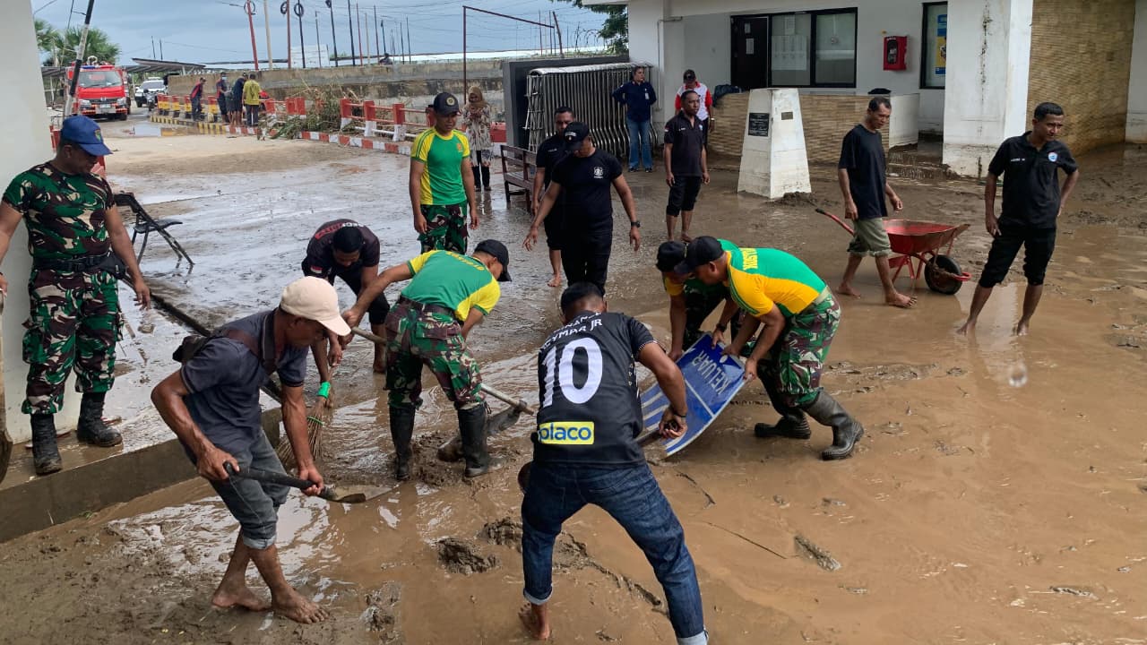 Luapan air sungai yang terjadi setelah hujan dengan intensitas tinggi menyebabkan lumpur terbawa hingga ke area sekitar PLBN Motaain. Melihat kondisi tersebut, personel Pos Motaain bersama para karyawan PLBN bergerak cepat melaksanakan karya bakti dengan menggunakan peralatan sederhana untuk membersihkan endapan lumpur agar aktivitas di kawasan perbatasan dapat kembali berjalan dengan normal.