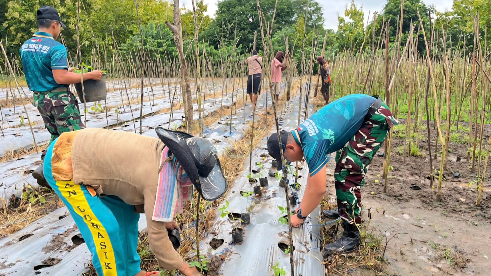 Dalam kegiatan tersebut, personel Pos Nananoe turut serta secara langsung membantu proses penanaman bibit tomat di lahan yang telah disiapkan. Kebersamaan terlihat saat prajurit dan warga bekerja berdampingan menanam satu per satu bibit dengan penuh semangat gotong royong.